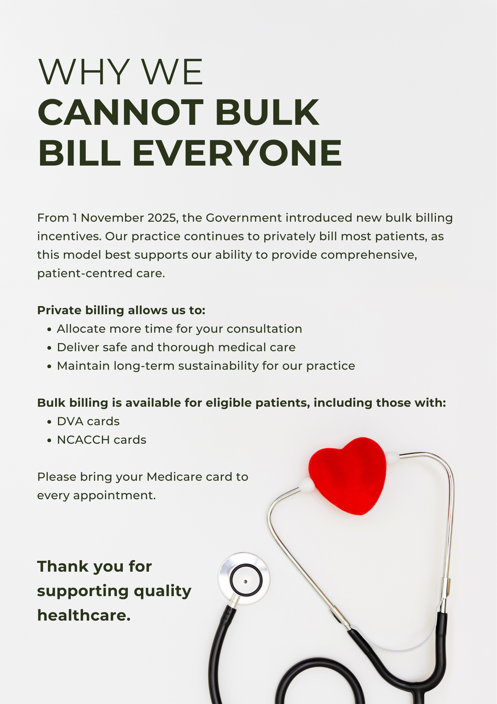 The Doctors at this practice bulk bill DVA & NCACCH card holders, as well as Health Assessments and Chronic Disease Management patients. Please bring your Medicare card with you at all times.
